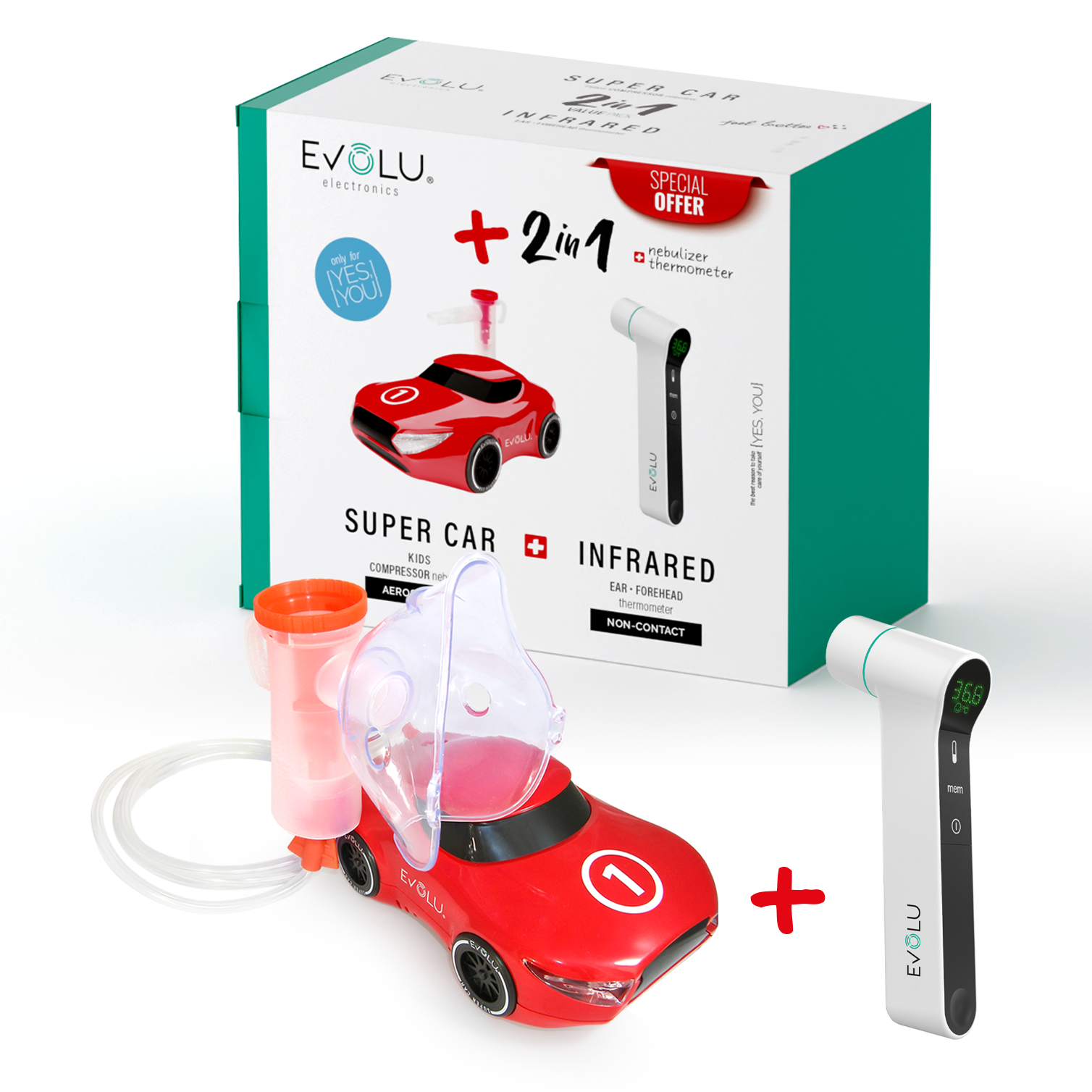 SUPER CAR formos dizainas pagamintas kaip lenktyninis automobilis, kuris sumažins jūsų vaiko baimes dėl inhaliacinės terapijos. Infraraudonųjų spindulių termometras NON CONTACT skystųjų kristalų ekranas rodomas pagal spalvų schemą „šviesoforas“ (žalias, geltonas, raudonas), kad būtų galima nustatyti kūno temperatūrą realiuoju laiku, net jei nėra šviesos.